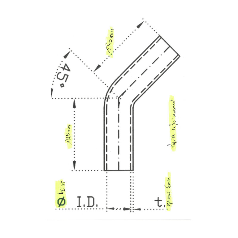 High-performance 45° silicone elbow hose with 40mm internal diameter. 5-ply VMQ/polyester construction with 6mm wall thickness for maximum strength. Lengths L1 125mm and L2 150mm. Temperature range -50°C to +180°C. Ideal for intake, cooling, turbo circuits. Clamps included, 3 colours available. Lifetime REDOX warranty. Permanent stock, same-day dispatch.