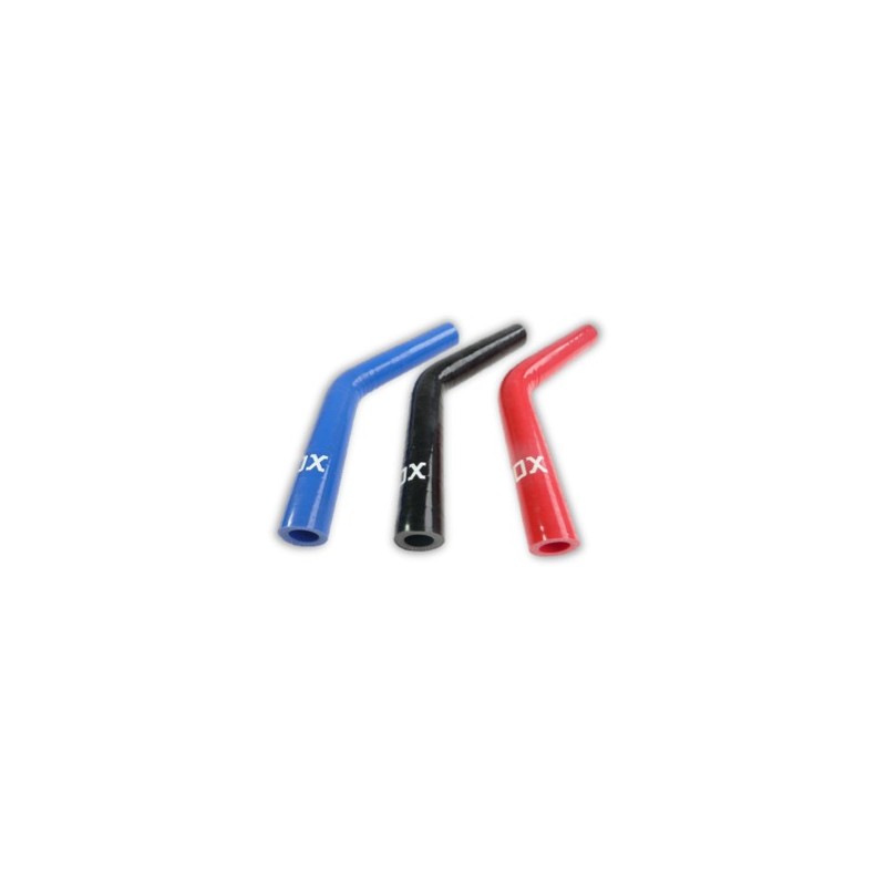 45° VMQ silicone elbow, 19mm internal diameter, 100mm length. 3-ply construction with polyester fabric reinforcement, 4mm wall thickness. Resistant to coolant, oil vapours, fuel vapours and turbo charge air. Temperature range: -60°C to +180°C. Available in blue, black and red. Permanently in stock, same-day dispatch before 5pm.